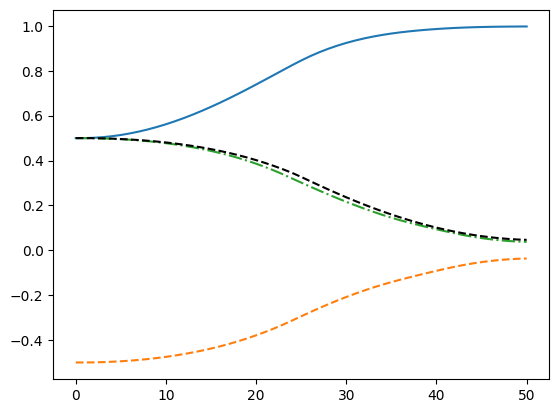 The MPC problem above is implemented in acados OCP class using a multiple-shooting SQP based on HPIPM with a small L-M regularization. With an initial $q_0 = [0.5,\,-0.5,\,0.5,\,0.5]$ and goal $q_g = [1,0,0,0]$, the plot shows the resulting quaternion attitude trajectories.