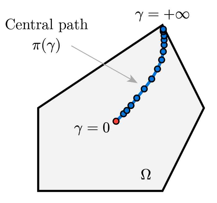 \[r_{\mathrm{cent}}^{\mathrm{cc}} := \operatorname{diag}(s)\lambda - \sigma\mu\,\mathbf 1 + \operatorname{diag}(\Delta s_{\mathrm{aff}})\,\Delta\lambda_{\mathrm{aff}}.\]Thus the centering–plus–corrector step $\Delta w$ is obtained by solving