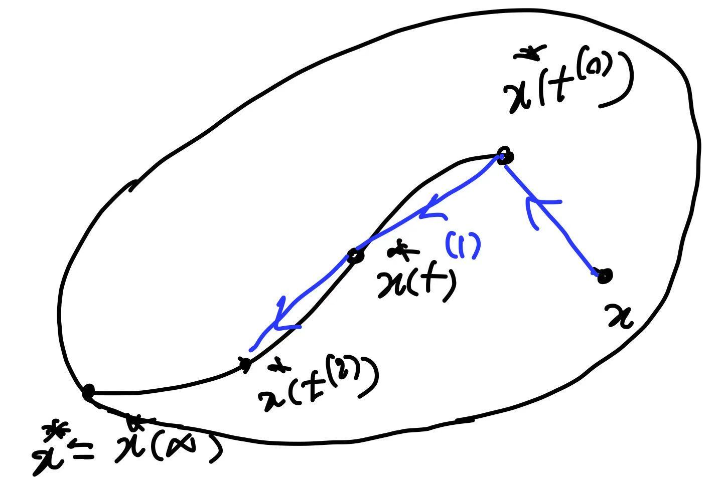Consider a family of barrier problems parameterized by $t>0$, \(x^{\star}(t) = \arg\min_x \; t f_0(x) + \phi(x),\) whose central path is characterized by the first-order condition \(F(x,t) := t\nabla f_0(x) + \nabla\phi(x) = 0,\quad F(x^{\star}(t),t)=0.\) Differentiating this identity with respect to $t$ and using the implicit function theorem gives